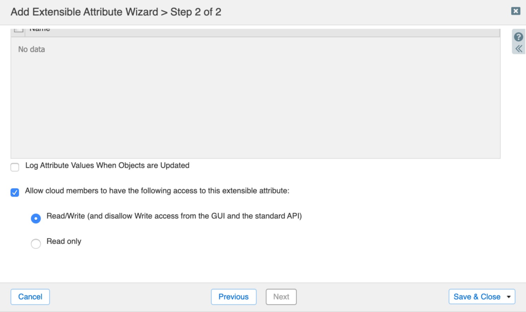 On Step 2, Select the checkbox for “Allow cloud members to have the following access to this extensible attribute:”, Select Read/Write.