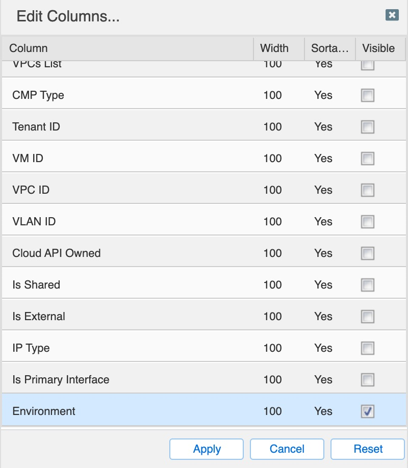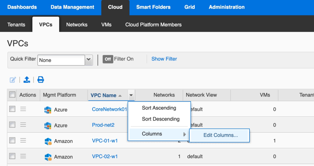 We’ll start on the Cloud tab, VPCs tab. Click the dropdown next to any column name. Expand Columns and click on Edit Columns.