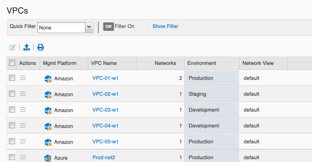 To illustrate how this feature works and can be used, our example will include a multi-cloud environment, with virtual networks in both AWS and Azure. To facilitate the management of these networks, we’ll divide them into three environments based on their use: Development, Staging, and Production.