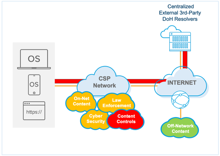 Let’s not forget about security. With CSP infrastructure bypassed, DNS-based security controls that protect subscribers from common threats such as lookalike domains and malware sites are also bypassed, increasing exposure to data exfiltration and malware proliferation on the provider network. It’s one of the reasons why the United States National Security Agency (NSA) recently posted guidance that organizations host their own DoH resolvers and avoid sending internal DNS traffic to external third-party resolvers. Within months of being released, we saw malware that used DoH to encrypt malicious communications allowing it to hide in regular HTTPS traffic and install malware that can steal data or add a victim to a botnet.