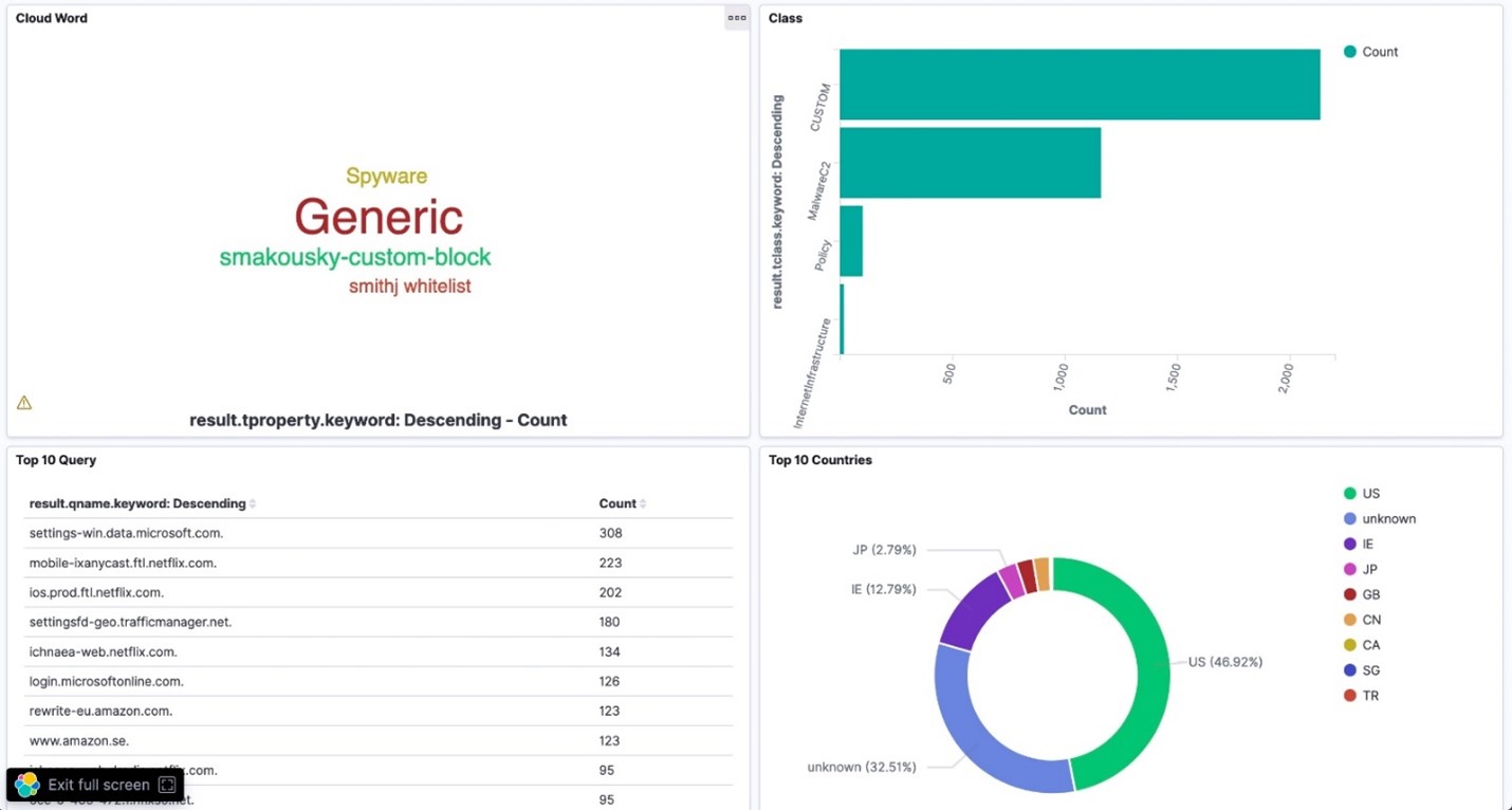 The below screenshots show some Infoblox data visualized in Kibana, the web user interface part of Elastic. See a demo video on interacting with the Kibana user interface here.