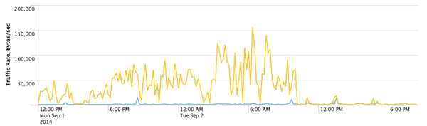 During the study I identified DrDoS, Random subdomain/Phantom domain attack, NXDOMAIN attack, protocol anomalies. A graph below clearly shows an amplification attack. Blue line is an incoming traffic and yellow is an outgoing traffic.