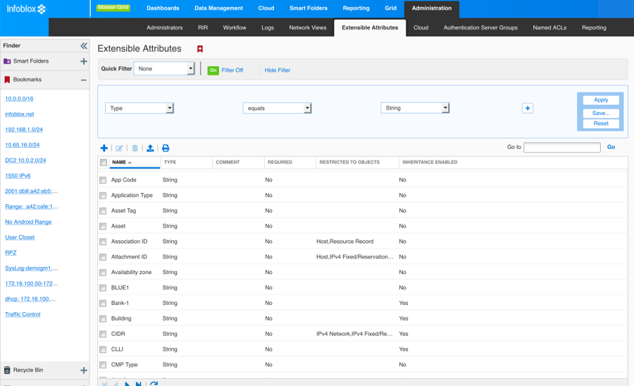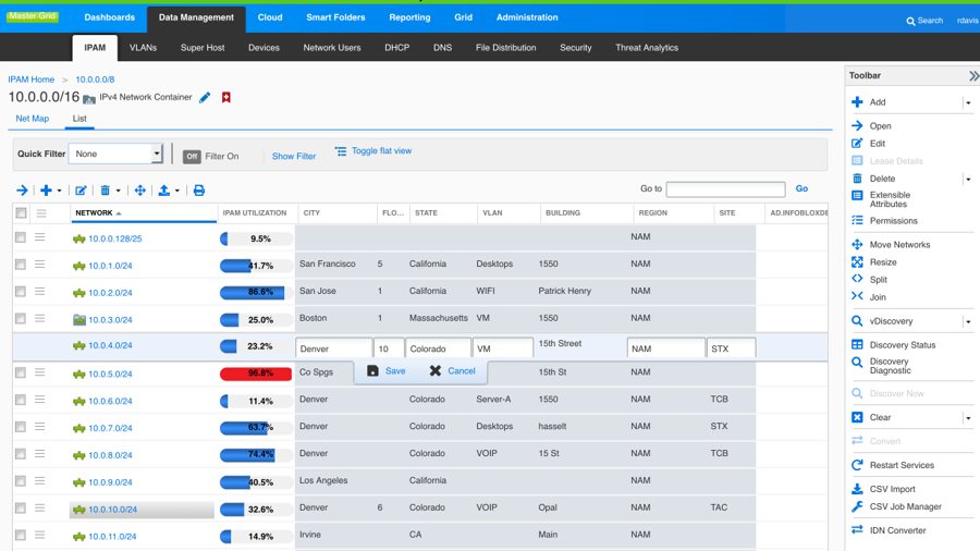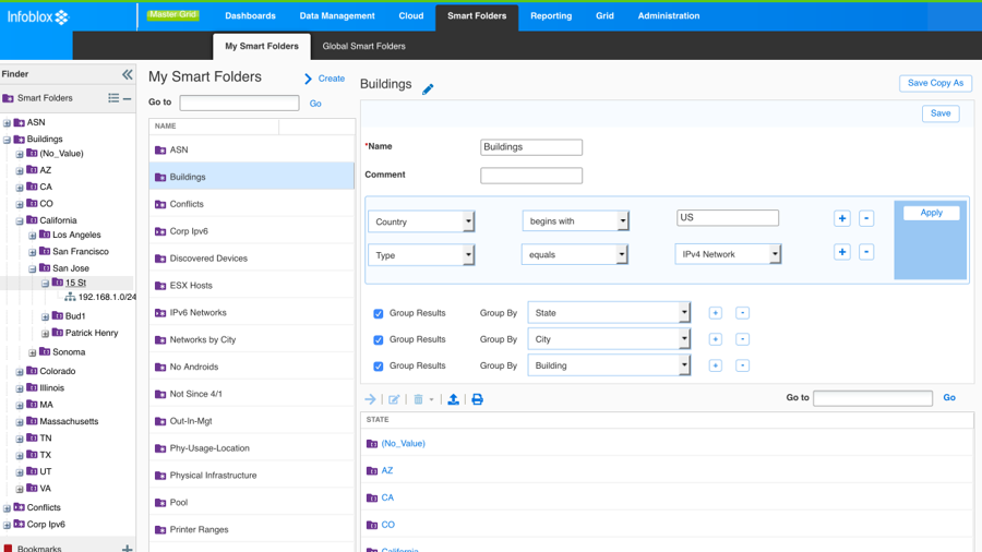Smart Folders are a navigation tool. Notice the Smart Folder navigation on the left. The Buildings Folder is open showing how it works. IPAM IP Address Management smart folders make it possible to navigate by extensible attributes rather than the network tree, which is the default.
