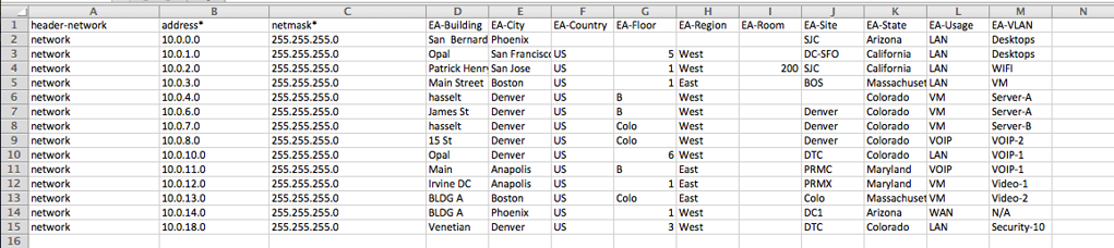 A CSV file can be created in Excel saving the file as CSV. The format above is required to make import work properly. Note that many networks can be imported at the same time and multiple extensible attributes can be attached to those networks.