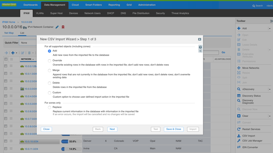 The wizard gives options on how to import the data into a Universal DDI platform, such as Add, Overwrite, and Merge.