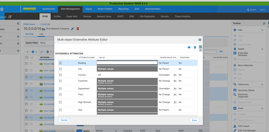 Multi-select edit to add attributes to multiple networks in the GUI. Select several networks by clicking the white box to the left of the network. Extensible Attributes shows up on the tool bar to the right. You can give any number of networks the same City, Building etc. with this selection.