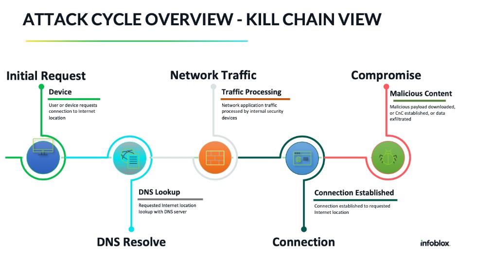 The smartest way to disrupt the entire kill chain is to shut it down at the very outset—at the point a device attempting to reach a malicious destination makes the initial lookup request to a DNS server. Using DNS as a first line of defense prevents resolution to a malicious domain at the beginning of the connection path—before those requests even reach next-gen firewalls, web proxies, and gateways. In cybersecurity, this concept is known as “shifting left,” moving defense measures to the left in the connection path.