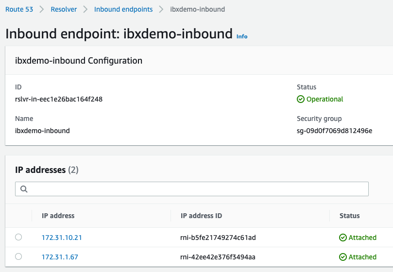 In the AWS Management Console, find the IP address(es) for your Route 53 Resolver inbound endpoint on the Route 53 > Resolver > Inbound endpoints detail page for your endpoint.
