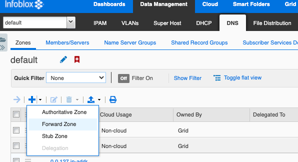 Next, log into your Infoblox Grid Manager and navigate to the Data Management > DNS > Zones tab. Expand the Add dropdown and select Forward Zone.