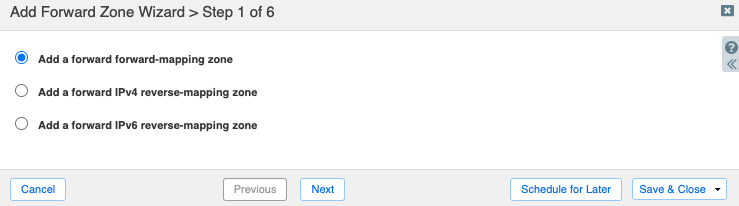 On step 1 of the Add Forward Zone Wizard, select Add a forward forward-mapping zone.