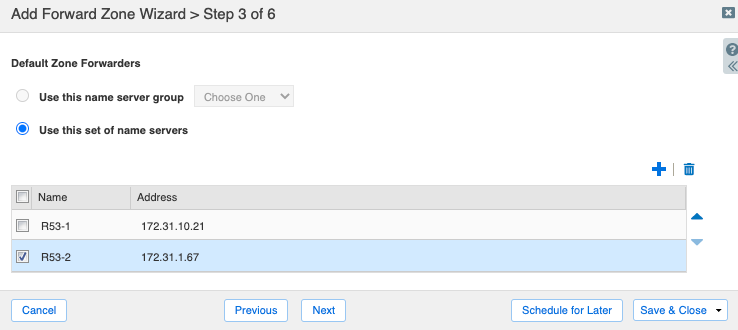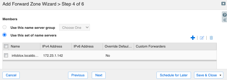 On step 4, select Use this set of name servers. Use the Add button to add Infoblox name servers that will serve this forward zone. Please note that for forwarding to work, the name servers must have recursion enabled.