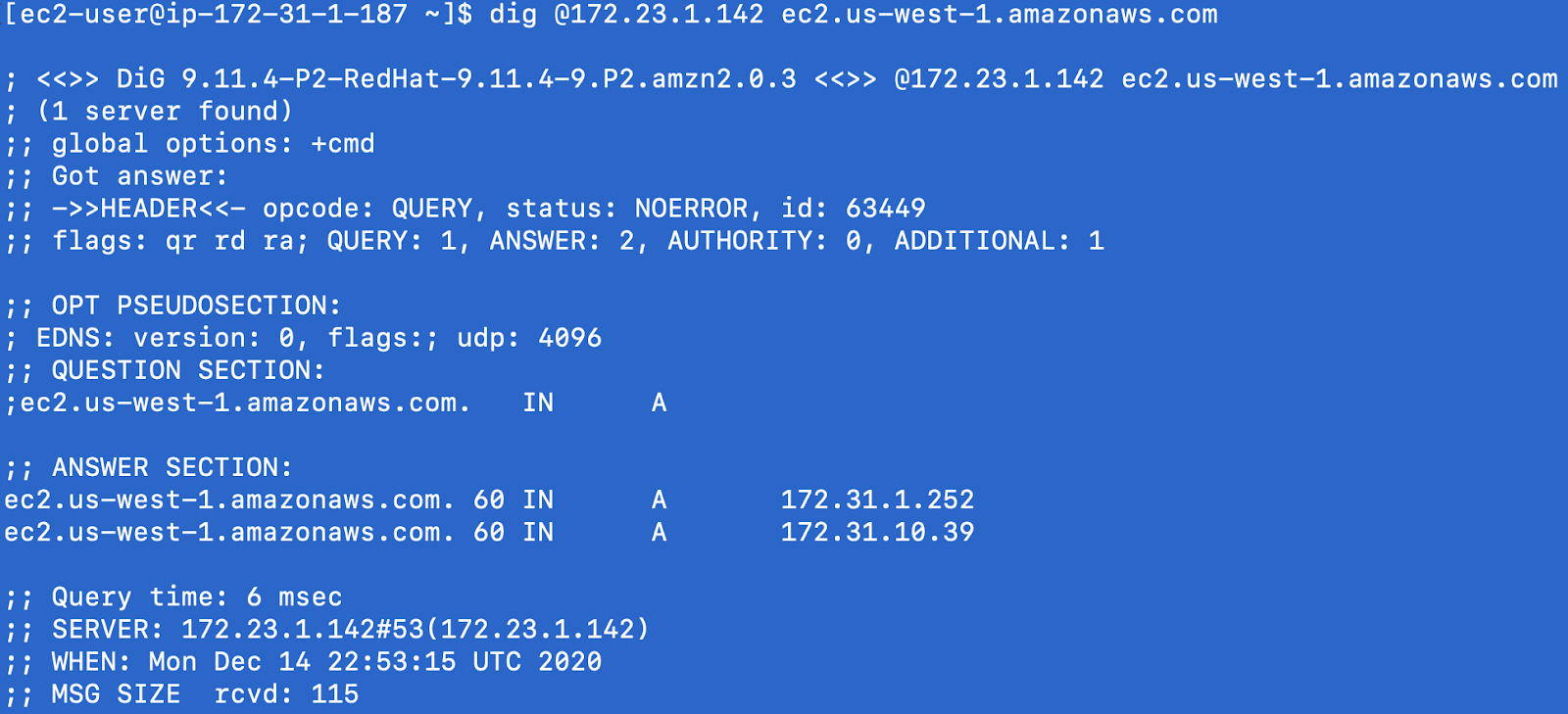 To test the configuration, use Dig or other tools to resolve for ec2.us-west-1.amazonaws.com. Notice the private IP addresses returned in this screenshot.