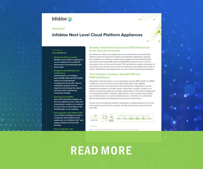 If you’re not familiar with our products, let me back up for a second. Infoblox’s appliances are purpose-built, high-performance hardware devices that form the foundation of a business’s core network services and reporting solutions. Our solutions for DNS, DHCP and IP address management (critical network services collectively known as DDI) work with a variety of physical and virtual appliances – and we offer a range of them to support any size environment. We then link your distributed appliances together with our Infoblox Grid (TM) architecture, to create a unified system that’s easier to manage, scales better and is more resilient to failures.
