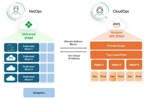 From Universal IPAM, NetOps centrally allocates an IPv4 address block for AWS and assigns a specific IPv4 address block to the Amazon VPC IPAM top-level pool. CloudOps then divides this address block into regional pools and does further planning from Amazon VPC IPAM. The integration enables seamless synchronization from Amazon VPC IPAM to Universal IPAM, providing visibility and optimizing resource allocations across on-premises and AWS.