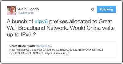 With these examples in mind, a recent tweet (below) from Alain Fiocco the head of Cisco’s 6lab (providing many of the IPv6 measurement graphs in this post) suggests Great Wall broadband may be preparing to deploy IPv6. Its parent company, MVNO Dr. Peng, reaches over 80 million broadband subscribers in China.