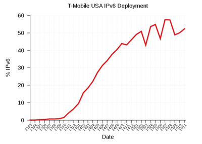In the North American region IPv6 adoption continues to accelerate. The US is home to several service providers that have been in the vanguard of deploying IPv6. As you can see from the graphs below (taken from the World IPv6 Launch measurements page), Verizon, T-Mobile, and Comcast are all several years into their IPv6 deployment initiatives (Figures 3-5).