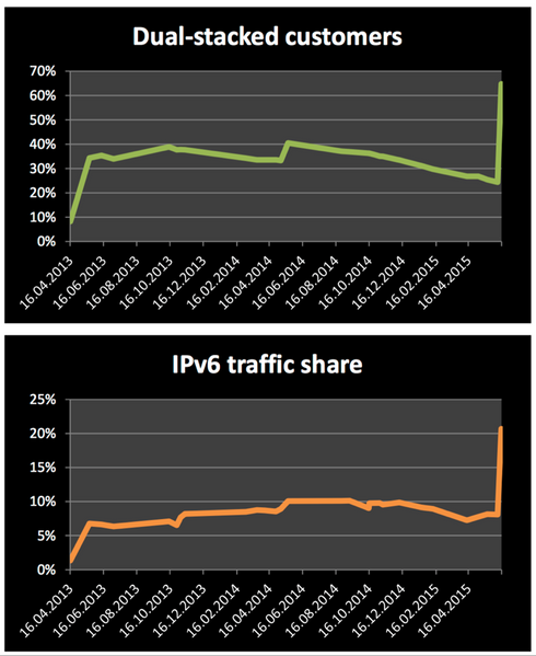 In it, he highlighted Swisscom’s success in enabling IPv6. According to the presentation 67% of their customers were dual-stacked with greater than 20% of Swisscom’s total traffic over IPv6 (Figure 1).