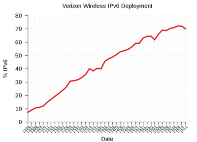 While Canada’s Telus has been diligently planning IPv6 for several years, even participating in World IPv6 Day as far back as 2011, they only enabled a large number of subscribers within the last two months (Figure 6).
