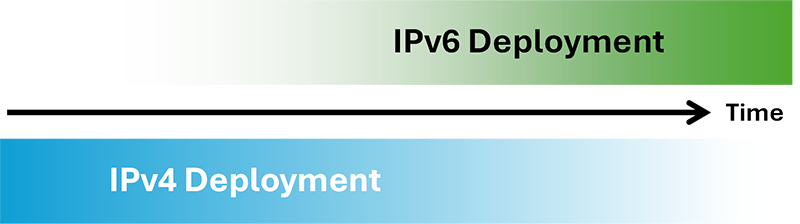 The same concern holds true for the journey from IPv4 to IPv6. Virtually all enterprise organizations start with a fully deployed IPv4 environment and then strive to make progress toward IPv6 deployment. Somewhere along the path, organizations move through a period of running IPv4 and IPv6 in parallel. However, organizations should not lose sight of the ultimate goal, which is to end up with a fully IPv6-only deployment.