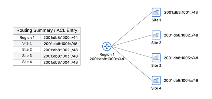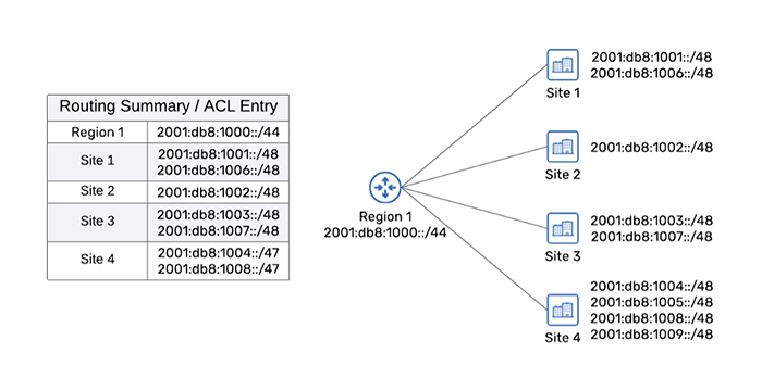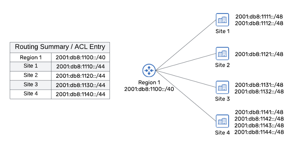 The following graphic depicts an alternate, more optimal outcome based on our previous example. Instead of assigning only 1 /48 per site initially, a /44 is per site is allocated. For this example, the network team doesn’t anticipate adding more than 16 sites total in Region 1 and so a /40 is allocated to it from which the /44 prefix per site is taken. Now when each of the sites require additional /48s – for whatever purpose – up to 15 additional prefixes will be available. These additional /48s per site will always be summarized as a /44 to Region 1, and Region 1 will summarize these upstream as a /40.