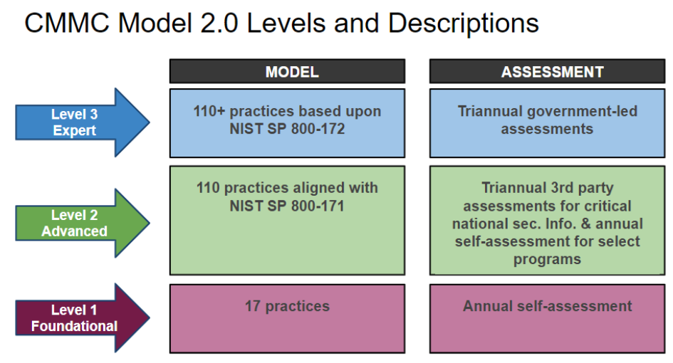 - A reduction in the CMMC levels from five to three. The new CMMC 2.0 levels are Foundational (Level 1), Advanced (Level 2), and Expert (Level 3). This greatly simplifies the CMMC specification and reduces the administrative burden across DOD contractors.