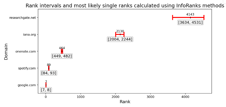 | Figure 1. Calculated most likely rank and rank intervals using InfoRanks methods for a sample of 5 domains. Ranks get more difficult to represent with a single value as plausible ranks get wider when popularity decreases. |