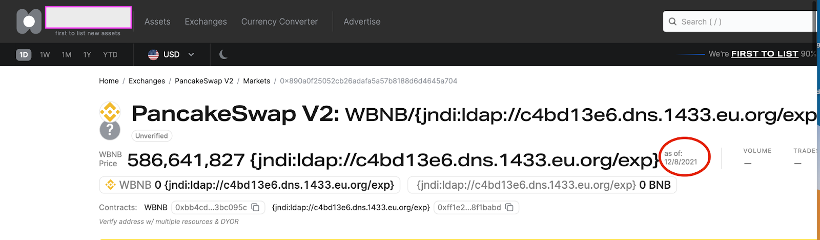 While the log4j library isn’t commonplace knowledge, and even developers may be unaware of its use in their systems, the evidence of possible attack surfaces is clear. The exploit of Minecraft servers via the chat system was widely reported on.¹ Websites were widely targeted. As shown in the images below by the strings that include “{jndi”, we observed targeting of everything from cryptocurrency exchanges to crisis center websites. But the vulnerability exists in many other applications which utilize the log4j library under the hood; the National Security Agency’s Cyber Security Director noted that even the reverse engineering software GHIDRA was initially susceptible to the exploit.²