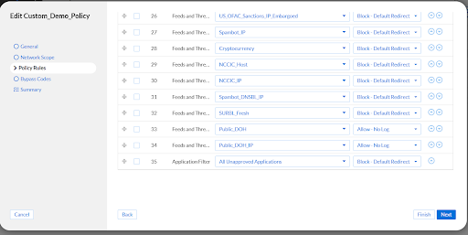 Adding an application filter to a security policy is similar to adding a custom list, or a feed to a policy. In the Policy Rules tab of any policy Application filters can be added. In the screenshot you can see that I added the automatically generated ‘All Unapproved Applications’ list, and set it to block with a redirect (and logging).