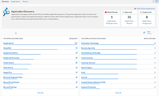In the Application Discovery interface we can view a variety of tables containing the following information: top applications, categories of applications used, top applications that are needing review, top devices that are using unapproved applications, and top unapproved applications. Here and on the Applications page, highlighting an application will show more information about it. Also, clicking any hyperlinked text will take us to the Applications tab with a filter that matches the hyperlink that was clicked.