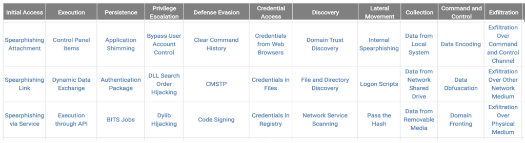 The MITRE ATT&CK matrix organizes all known attack tactics and techniques into an easy to understand format, with the 11 different tactics that represent the different stages of the attack across the top. Multiple techniques to accomplish each tactic is listed down each column. A successful cyberattack sequence is built from moving from the leftmost column (Initial Access) to the rightmost column (Exfiltration).