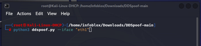 The tool searches for DHCP servers on the local area network via the IPv4 broadcast address, 255.255.255.255. When a server is found, it steps through the DHCP DORA process (Discover, Offer, Request, Acknowledge), which allows for the automatic assignment of IP addresses to clients that request them. When DDSpoof discovers a DHCP server on our network, it asks us what our desired IP address is.