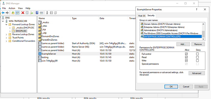 The DHCP server is also using its own account to request DNS updates on the client’s behalf. With DHCP running on the Domain Controller (DC), the DHCP server’s account is in the Enterprise Domain Controllers group, which has full control over all DNS records in the zone (in this case the DNS domain dhcpv.dc). The image below shows a static A Record in our zone. Because our DHCP server is the DC, it can update this record to point wherever it chooses.