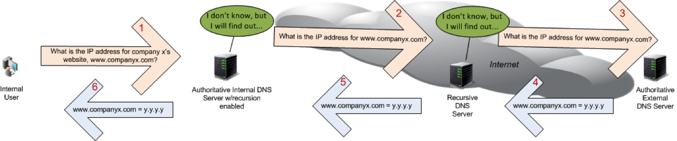 Internal Authoritative DNS is responsible for answering all of the DNS queries from your internal users, applications, servers, and network infrastructure as they look to connect with and interact with your networks and services. For Active Directory, for example, the end-user system must perform DNS lookups to locate Domain Controllers and their services. Tiered applications will perform DNS lookups to locate web servers, database servers, storage and so forth. Internal Authoritative DNS provides all of these answers as quickly as possible—often handling thousands of queries per second—so there are no noticeable delays in common functions such as email retrieval and the loading of web pages within a web browser. Internal Authoritative DNS should contain all of these IP to name mappings for all of the company’s infrastructure.