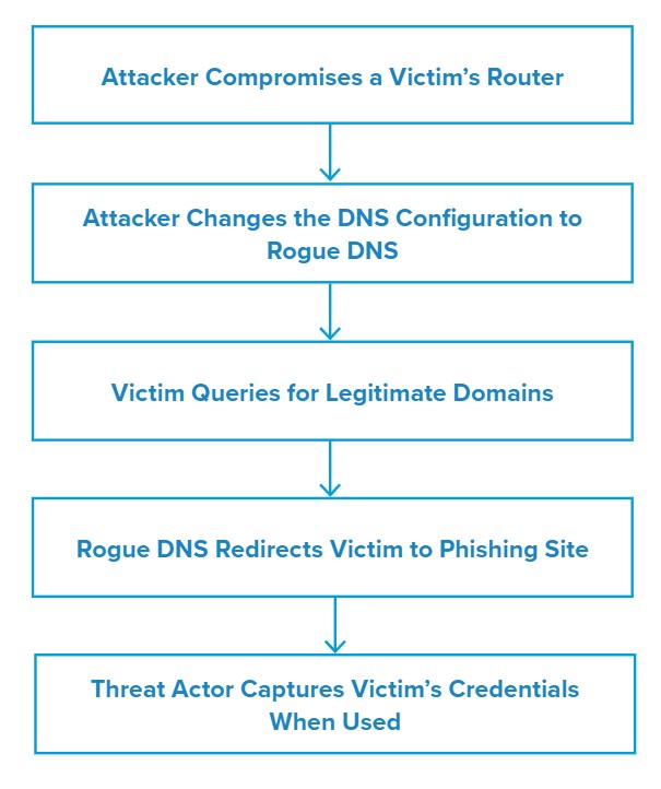 When the victim queries a specific domain, the Rogue DNS server redirects them to a phishing domain that the actor can use to steal the victim’s credentials or lure them into downloading and executing malware.