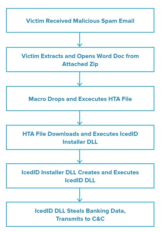 Once the victim does so, a malicious macro drops a malicious Microsoft HTML Application (HTA) and executes it via Windows Management Instruction (WMI). The HTA file then attempts to download and execute the IcedID installer dynamic-link library (DLL) from one of several domains controlled by the attacker. Inthis campaign, the malware saved the installer DLLs with a .JPG file extension to obfuscate their intended purpose.