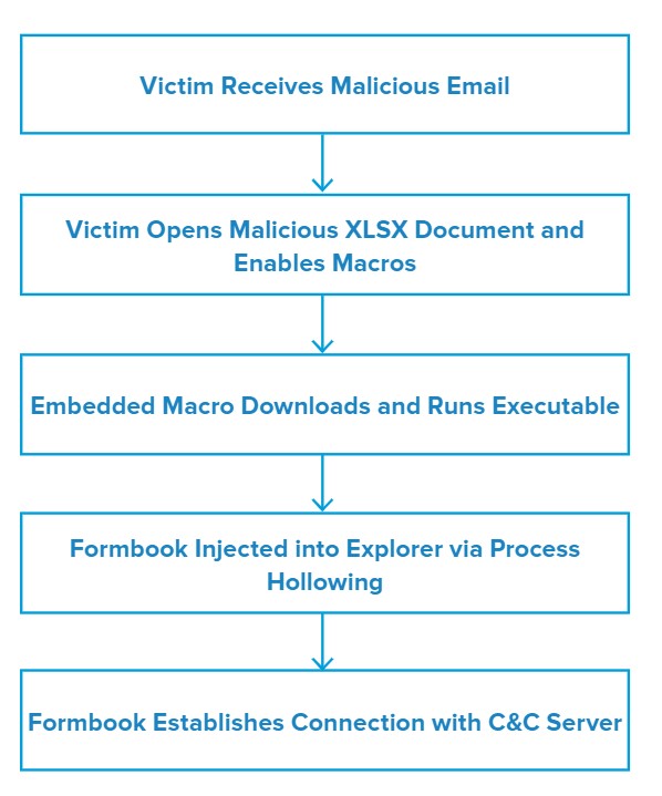 Next, the macro runs the executable, which spawns a new Explorer process and injects Formbook code into it using a technique known as process hollowing.