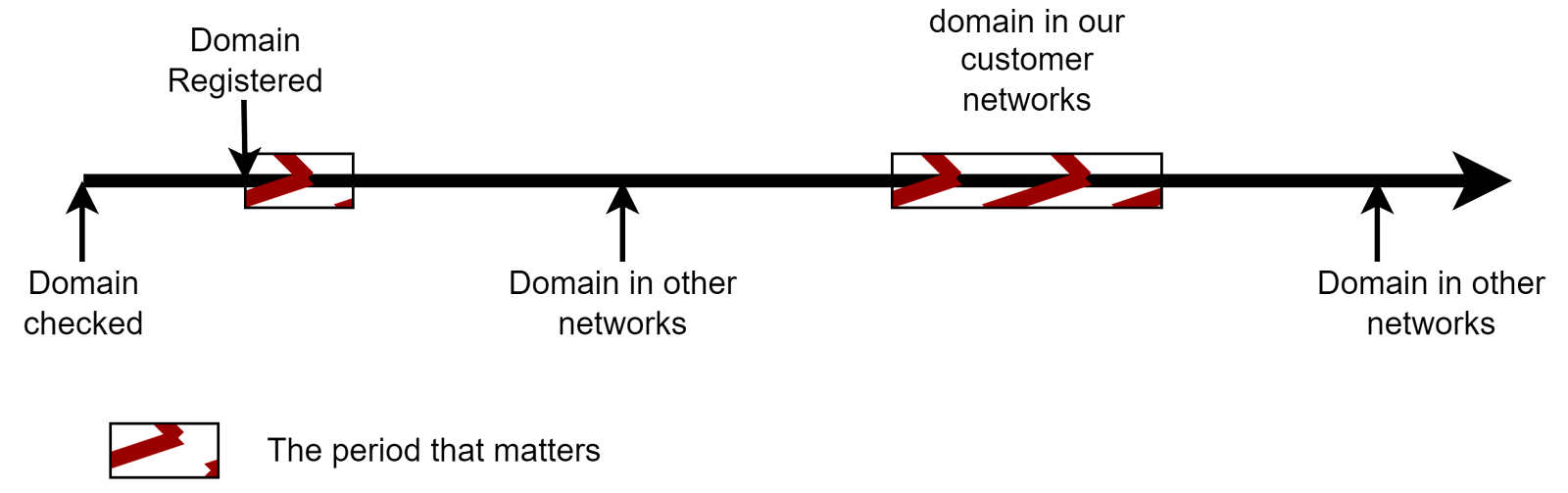 As threat actors have matured over the last decade, they have learnt how to evade standard industry detection methods and they constantly adapt. It is known that they will often register a domain, but not use it for some time: a technique called strategic aging. They may also dribble DNS queries onto the internet, ensuring that the domain gets observed by security vendors, before leveraging it in malicious activities. This results in domains that have low risk when activated. We often see strategic aging of domains for between 14 and 120 days, sometimes longer. In other cases, but less frequently now, domains will be registered and used immediately. Our algorithms revisit domains multiple times in an effort to isolate those that pose an active threat in our customer networks.
