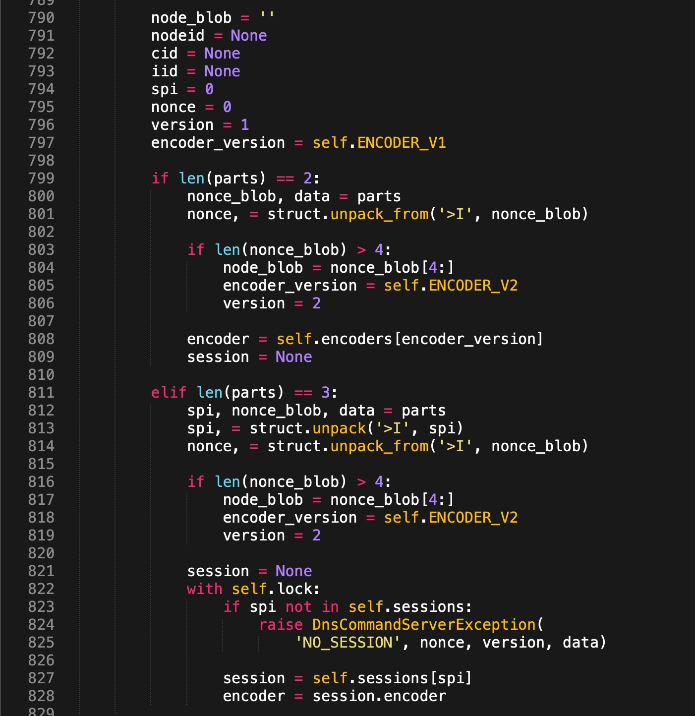 The _q_page_decoder() explicitly looks for FQDNs that are exactly 2-3 labels long and parses them according to the format {nonce}.{payload} for 2-label FQDNs, or {spi}.{nonce}.{payload} for 3-label FQDNs (see Figure 13 below). The functional meaning of each type of label is as follows:
