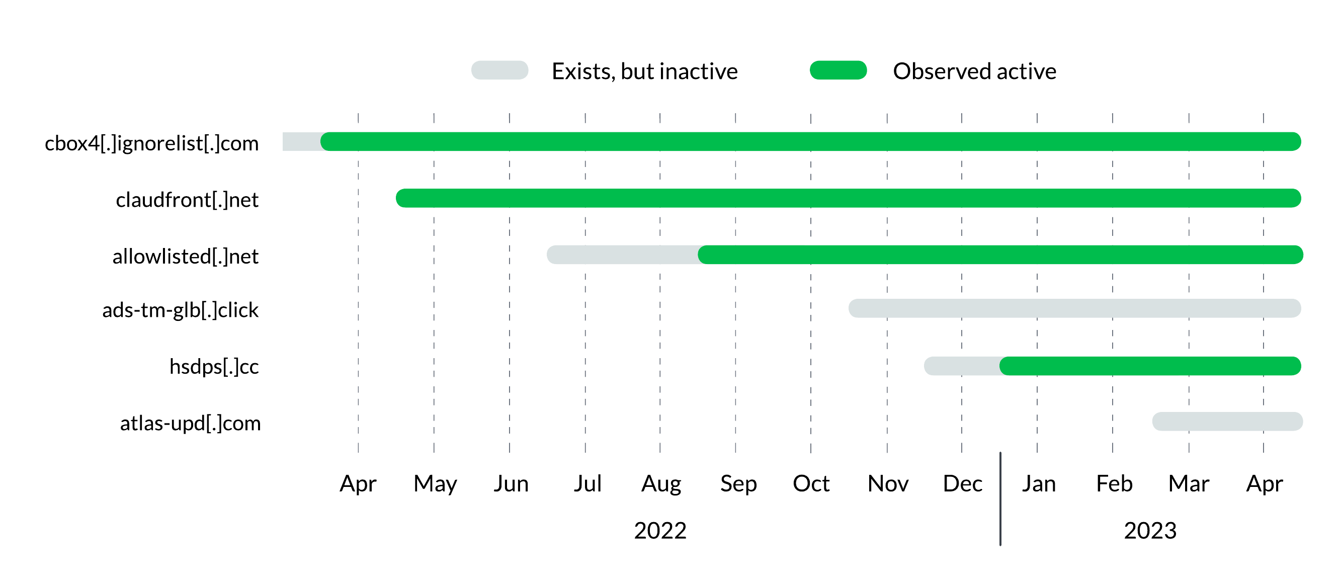 Figure 2. The timelines of Decoy Dog domain activity. Not all domains are activated as of this writing.