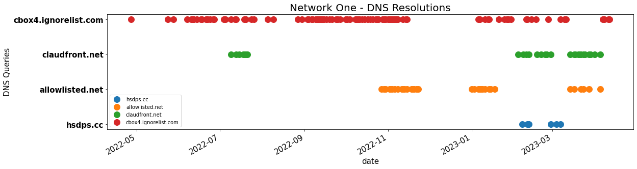 Figure 3. The pattern of resolved queries over time by domains within a single network from April 2022 to April 2023. Each dot represents a DNS resolution on a given day. The domains on the graph, from top to bottom, are: cbox4[.]ignorelist[.]com, claudfront[.]net, allowlisted[.]net, and hsdps[.]cc.