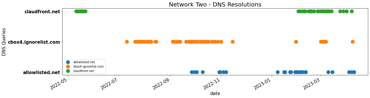 Figure 4. The pattern of resolved queries over time by domains within a different single network. Each dot represents a DNS resolution on a given day. The domains on the graph, from top to bottom, are: claudfront[.]net, cbox4[.]ignorelist[.]com, and allowlisted[.]net.