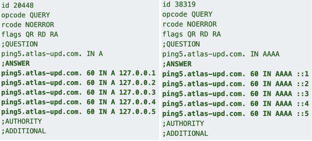 Another common DNS attribute was a ping subdomain. The function of this resource is to return one or more reserved local addresses depending on the exact variation of the subdomain. Querying for {ping}.domain will always return 15 private loopback IPs via the DNS A and AAAA records. Alternatively, appending a number after {ping} will return that many IPs. For example, a query to ping5[.]atlas-upd[.]com always returned 5 private loopback IP addresses. See Figure 6.