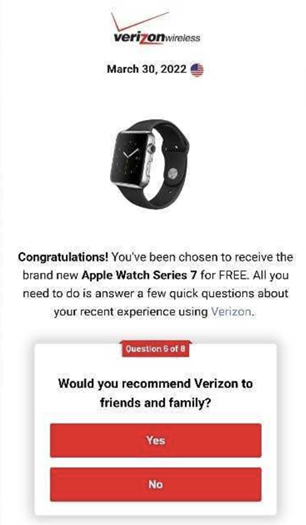 The link in Figure 1 above used the domain oifc21[.]xyz, but we saw a variety of domains used. We will call the domains in the text messages the “front-end domains”. We saw these domains use only the top-level domain (TLD) .xyz. When we clicked on the link, it did not lead us to oifc21[.]xyz; instead, multiple redirects occurred before a final landing page was presented. In this instance, we were redirected to goodasgold[.]shop, then takeoneforlove[.]com, and then eshatl[.]xyz, which presented a fake Verizon survey page. After completing the survey, a message appeared that thanked us “for being a great customer” and asked us to click the displayed button to claim a new Apple Watch.