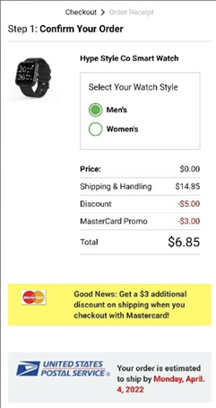 The threat actors tried to imbue their content with a sense of urgency; this is a common tactic used to pressure victims into complying with the scam. After we completed the survey, the webpage warned: “if you leave this page without claiming your reward, we have no choice but to give another loyal customer”. Clicking the button again redirected us to a new website, smartfashiondaily[.]com, where the actors asked us to pay $6.85 for “Shipping & Handling”. The actors also asked for our name, email address, phone number, mailing address, and credit card information.