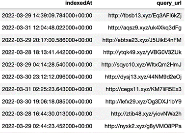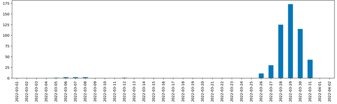 From several examples, we have noticed that the domains used in the SMS messages have a distinct pattern: four or five alphabetical characters followed by one or two digits, all in the TLD .xyz. This allowed us to create a simple regex and apply it to data for March and the start of April.