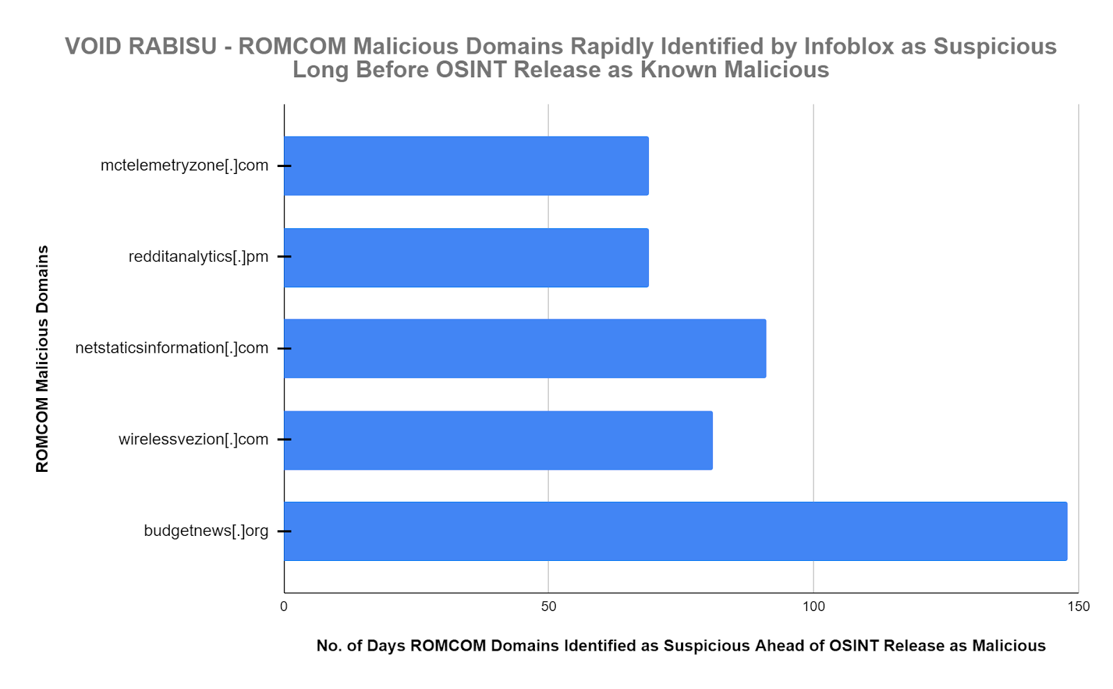 | Infoblox identified multiple ROMCOM malicious domains as suspicious an average of 91.6 days or over 3 months ahead of their identification and release as malicious in OSINT. This enabled our customers to block them and prevent execution of the ROMCOM Kill Chain. |