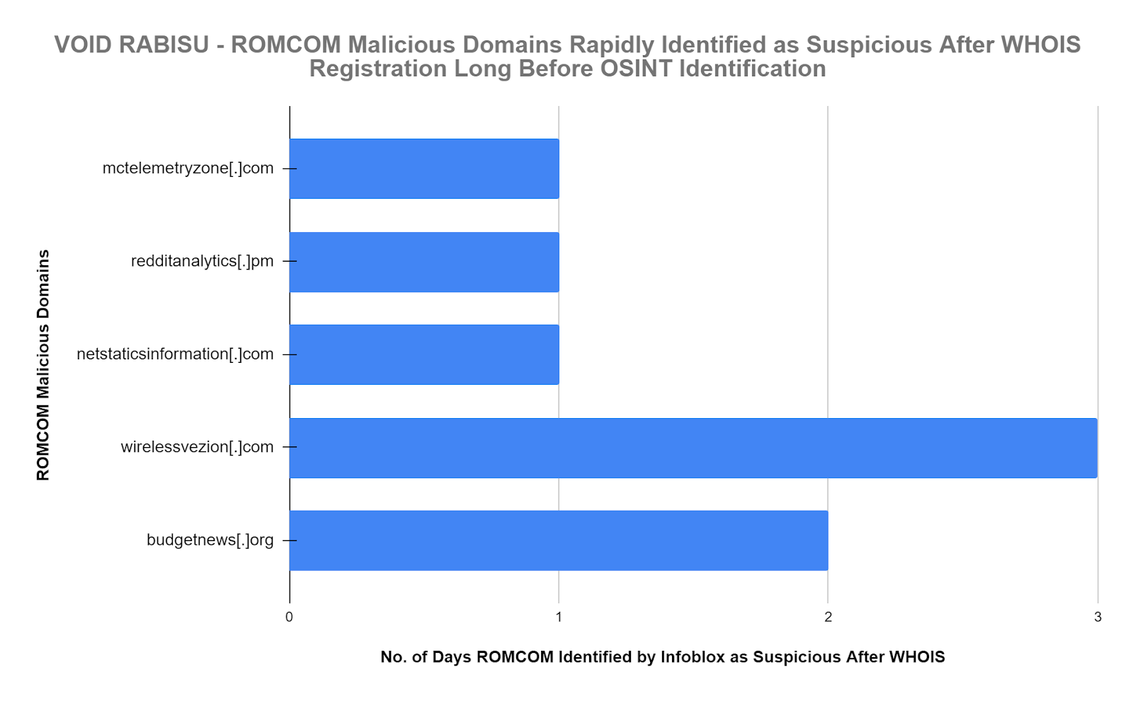 The conclusions of our analysis were definitive. Key ROMCOM domains which are critical path components of the ROMCOM Kill Chain were identified as suspicious by Infoblox threat intelligence an average of 91.6 days prior to the availability of the OSINT designation as malicious.