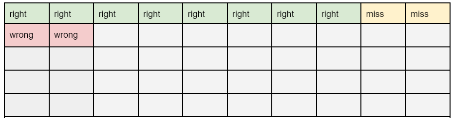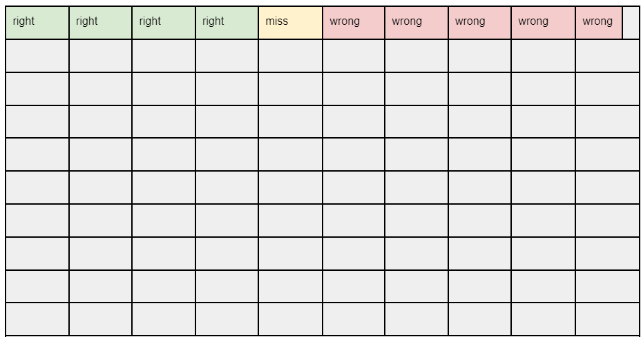 Figure 1. An illustration of algorithm performance on 50 domains. Our algorithm finds the squares marked in green/”right” and red/”wrong” from the full dataset of fifty domains, which is 8 of the 10 malicious domains. It missed two domains (marked in yellow/”miss”), and it falsely identifies two legitimate domains (marked in red/”wrong”) as malicious. The remaining, marked in gray, are legitimate. Each row contains 10 domains.