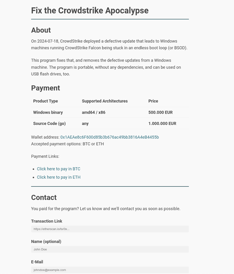 This site advertises a (probably fake)1 program that can restore Windows computers that have been affected by the outage, and offers two methods of payment, Bitcoin and Ethereum.