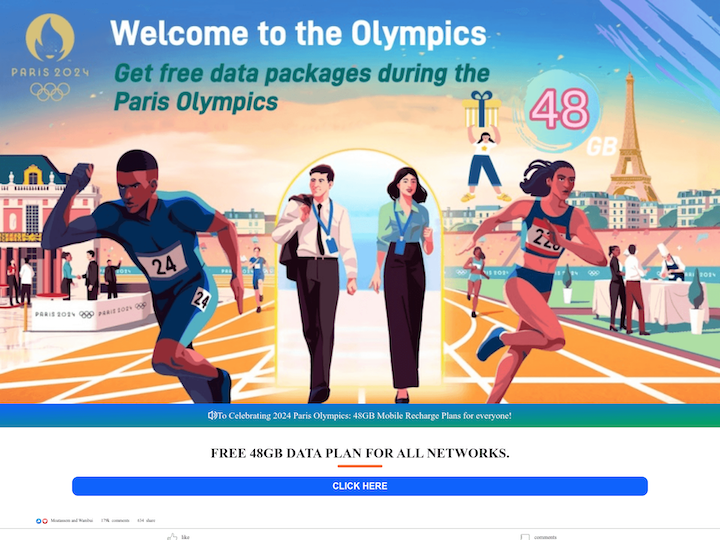 Similarly, there is a group of over sixty registered domain generated algorithm (RDGA) domains that share the website title “To Celebrating 2024 Paris Olympics Whatsapp offers 48GB free Mobile Recharge Plans!”. Figure 3 shows the website, which offers free data plans for the Olympic games. Many of these RDGA domains were registered a year ago with the intention to gather victims’ personal information in exchange for accessing the “free” service.